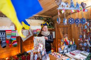 Lastava prossimo: Ebenso ist die ukrainische Partnerstadt Kyiv mit einen eigenen Stand vertreten. Die Partnerschaft mit München besteht schon seit über 30 Jahren. Im Angebot sind unter anderem handgenähte und bemalte ukrainische Weihnachtsornamente, die traditionell die Christbäume schmücken. Sie werden in der Koza Dereza Manufacture in Ternopil in der Westukraine gefertigt.