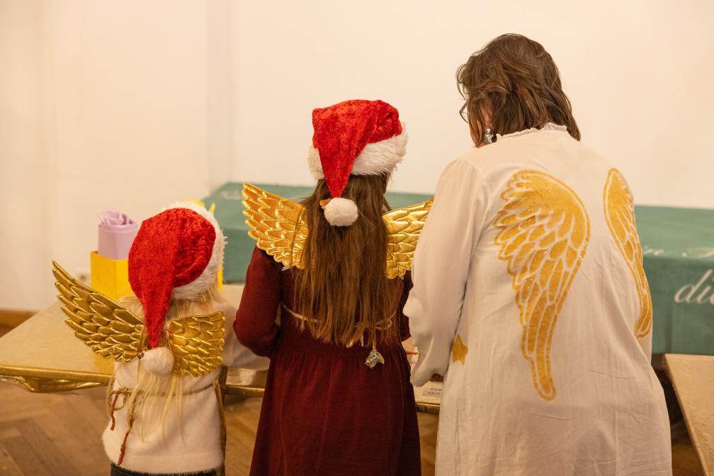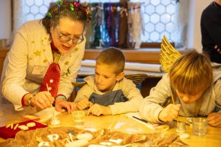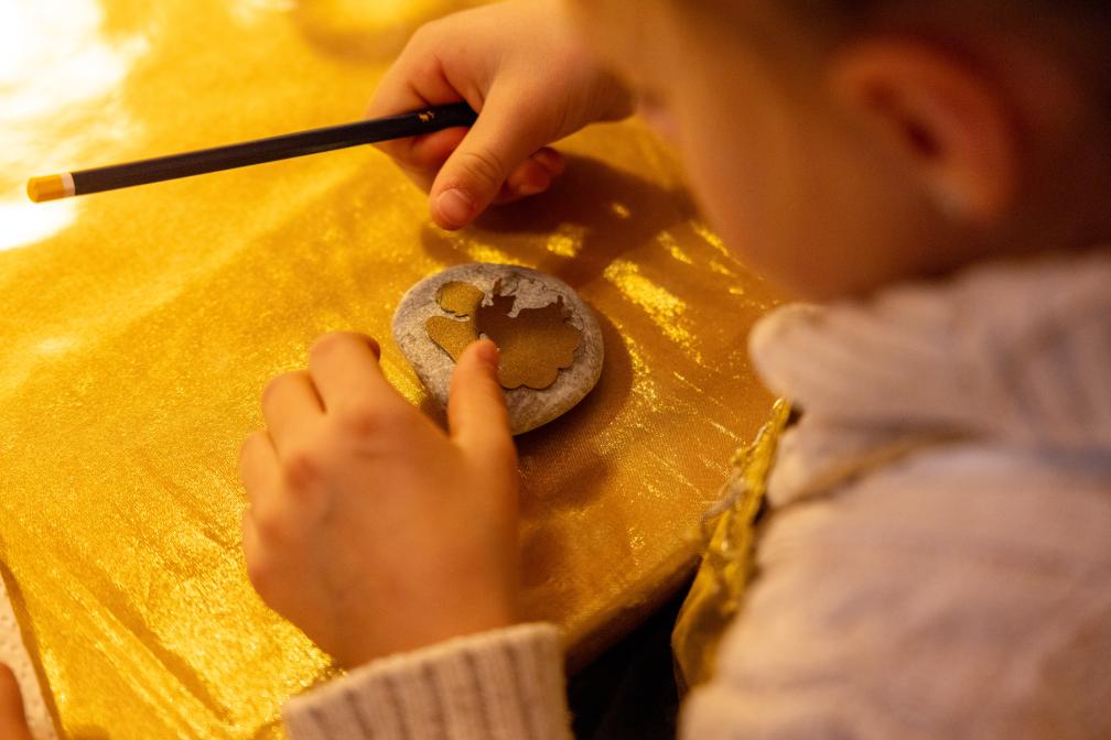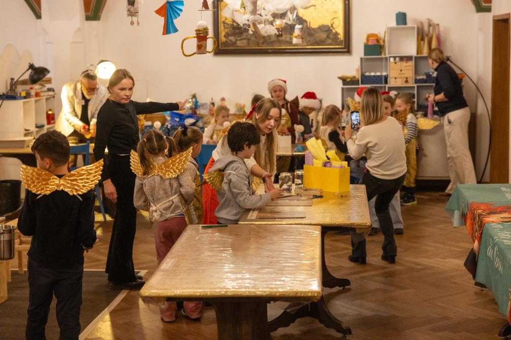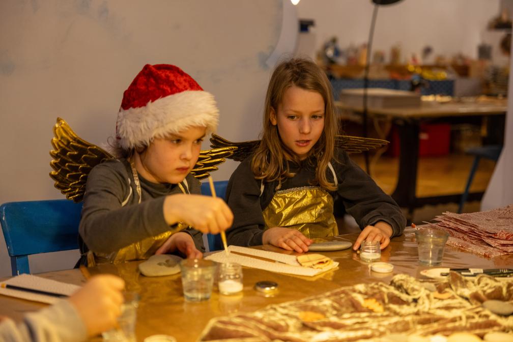 „Hier glitzert alles so schön, man kann sich goldene Flügel anziehen und es gibt ganz viel zum Basteln!“ Laura, 7 Jahre alt, ist mit ihrer Freundin Mia in der Himmelswerkstatt und gestaltet Weihnachtskarten. Ihr Freund Felix ist auch mit dabei, er trägt eine Nikolausmütze und einen glänzenden Umhang und hat sich fürs Kerzendrehen entschieden.